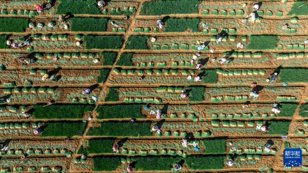 11月13日,菜農在曲靖市麒麟區越州鎮現代農業產業園采收小蔥(無人機照片)。新華社記者 胡超 攝