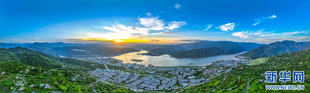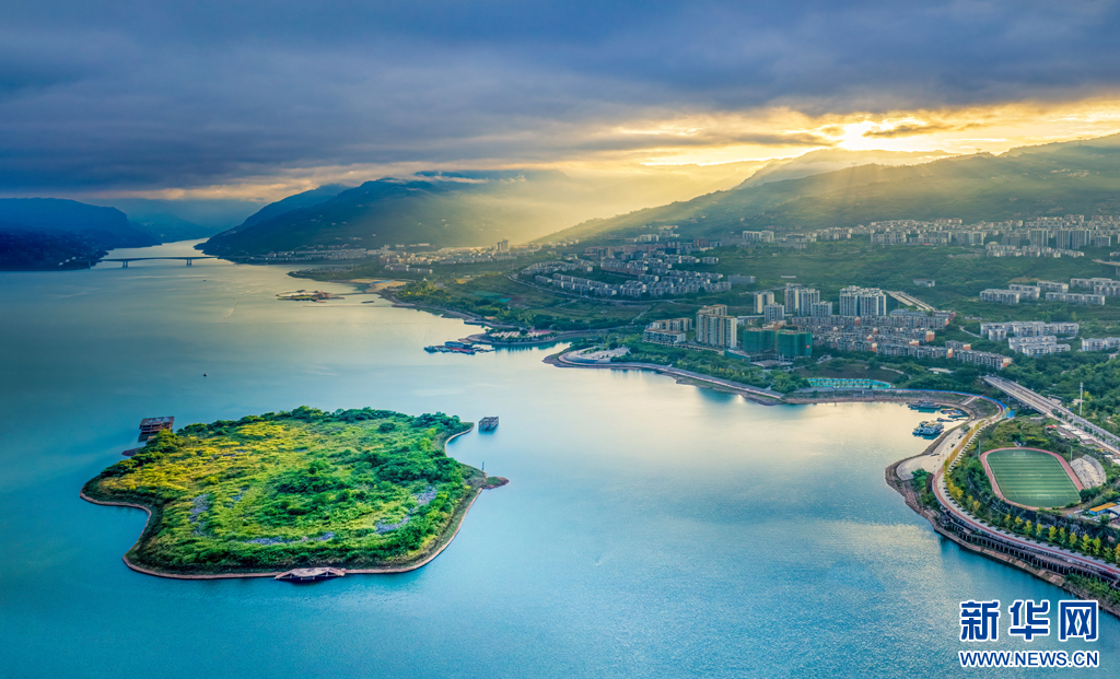 朝陽映襯下的江畔小城綏江,水清岸綠景美(10月23日攝)。新華網發(曾三東 攝)
