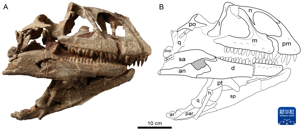 王氏栗樹龍的頭骨右側視照片及線條圖。(中國科學院古脊椎動物與古人類研究所供圖)