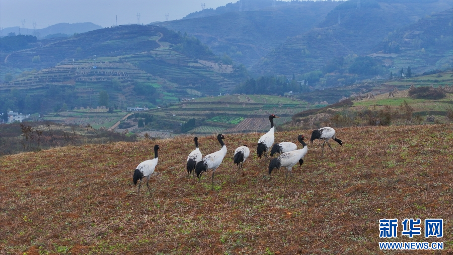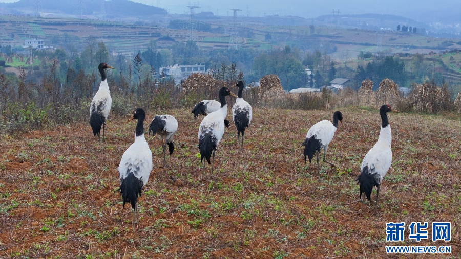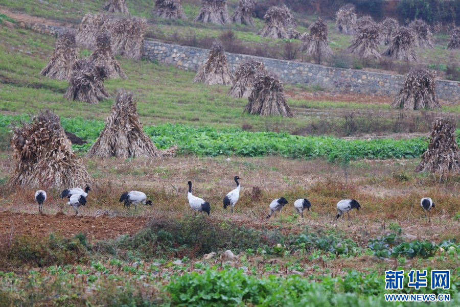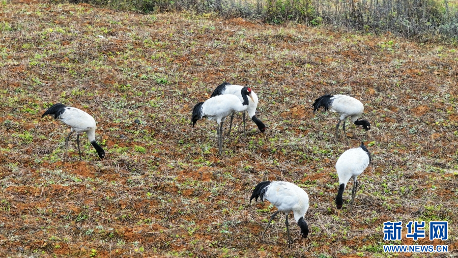 黑頸鶴在地里覓食。新華網發(視頻截圖)
