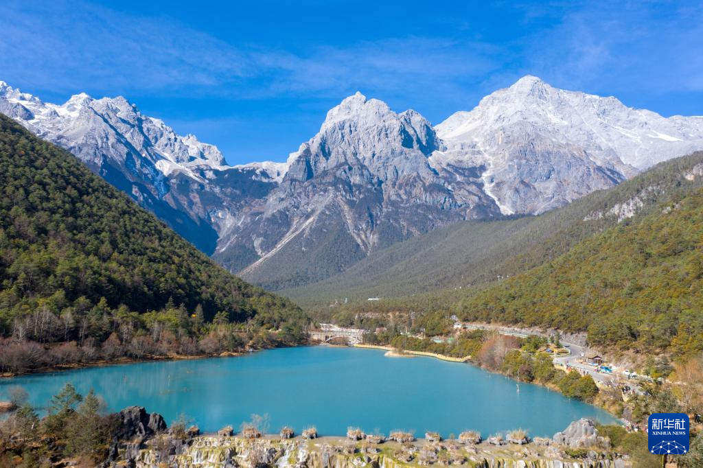 冬日里,云南省麗江市玉龍雪山景區藍月谷美景如畫,在穿越機的視角下,宛若插上翅膀,飛越仙境。