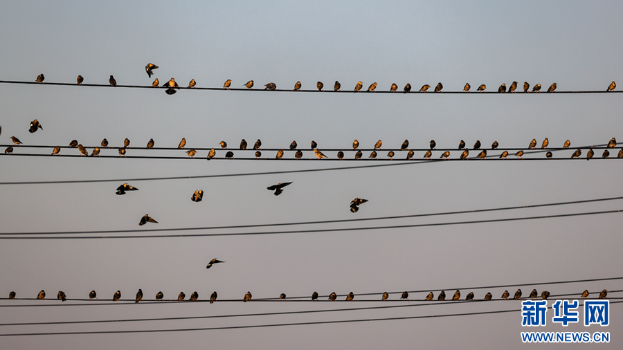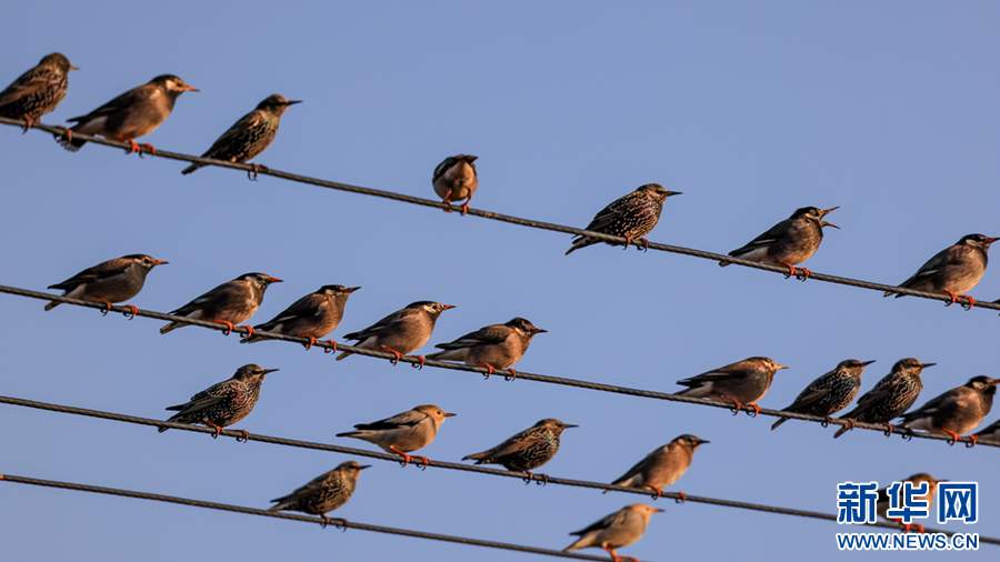 灰椋鳥成群立于電線上(12月14日攝)。新華網發(孫文來 攝)