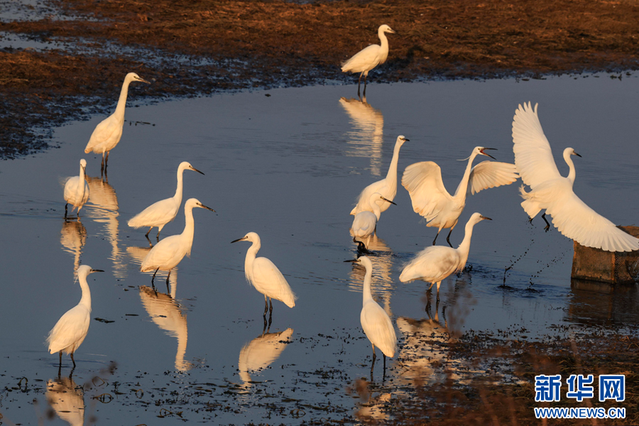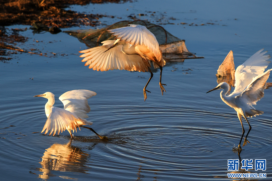 夕陽下,白鷺翩翩起舞(12月14日攝)。新華網發(孫文來 攝)