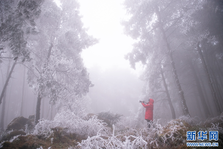 近日,攝影師在云南省文山壯族苗族自治州丘北縣舍得彝族鄉舍得草場拍攝到美麗的霧凇景觀。在銀裝素裹的山林間,松樹的枝干和針葉上掛滿了冰凌,身處其間,可以看到樹林里彌漫著陣陣霧氣,宛如走進了童話世界。新華網發(熊平祥 攝)
