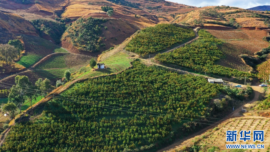 航拍鏡頭下的椪柑果園(12月22日攝)。新華網發(賓川縣融媒體中心供圖)