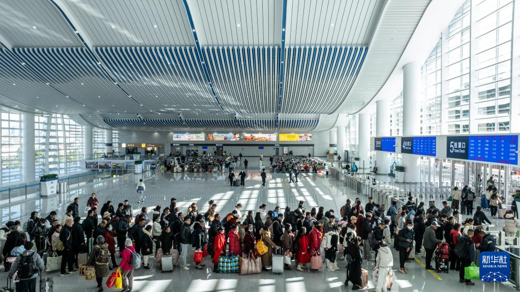 12月30日,旅客在云南大理火車站新建站房驗票進站(無人機照片)。