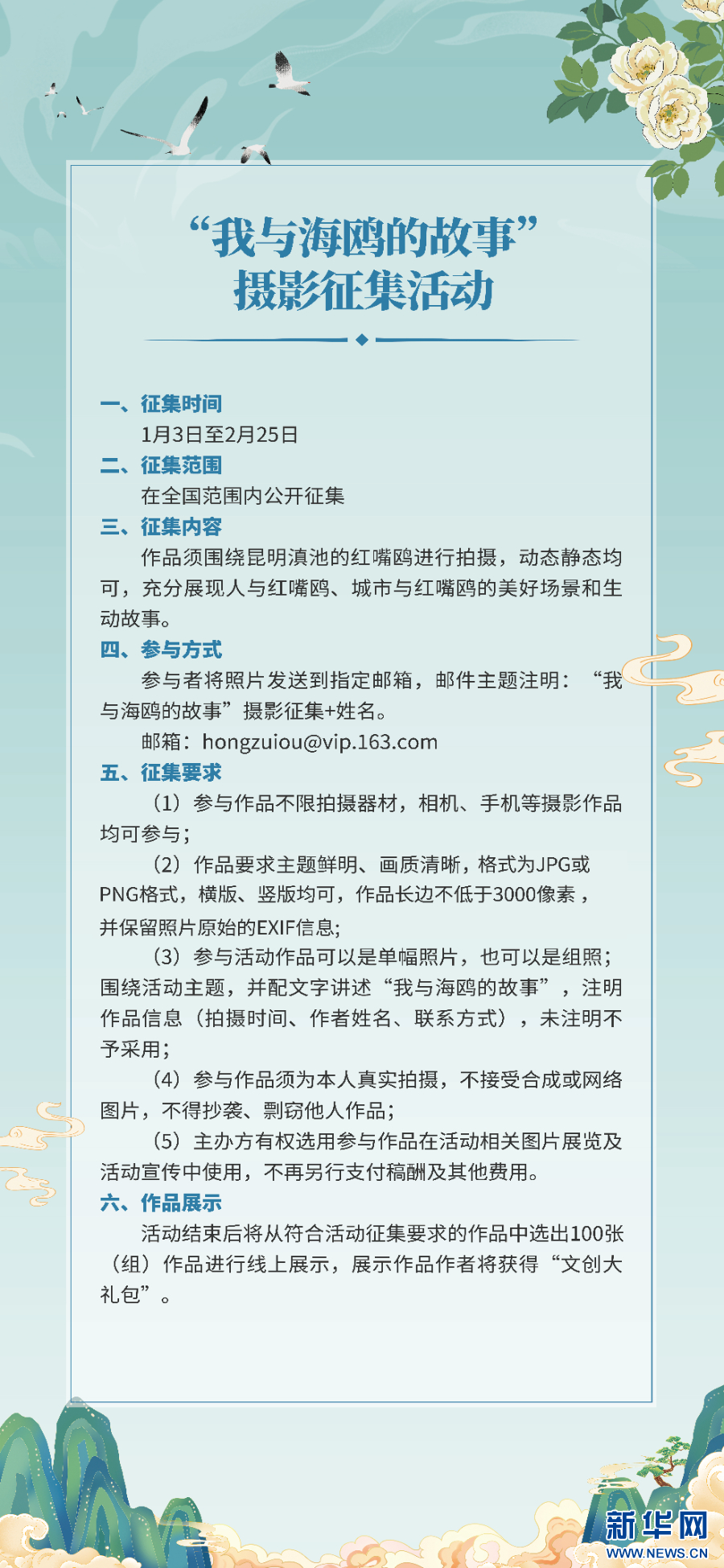 據了解,本次活動面向社會廣泛征集攝影作品,須圍繞昆明滇池的紅嘴鷗進行拍攝,動態靜態均可,充分展現人鷗和諧春城美的場景和故事。投稿照片可以是單幅照片,也可以是組照,并配文字講述“我與海鷗的故事”。鼓勵參與者以獨特的視角和創意,捕捉人與自然和諧共生之美。