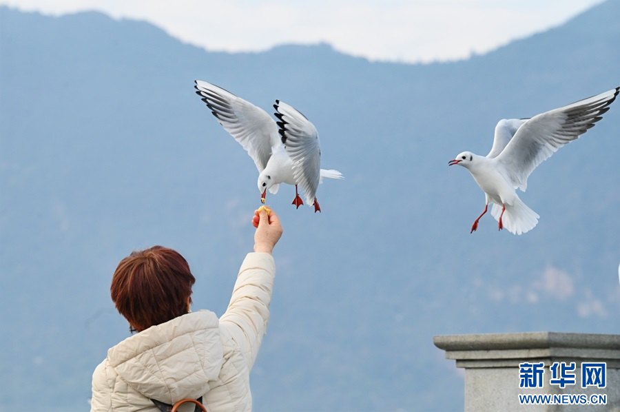 游客與紅嘴鷗互動(1月3日攝)。新華網發(徐華陵 攝)