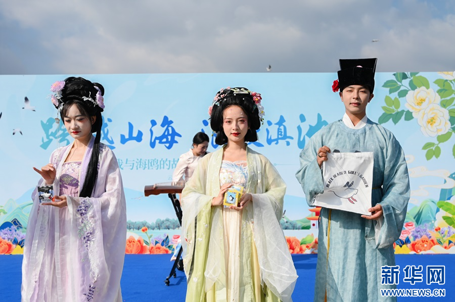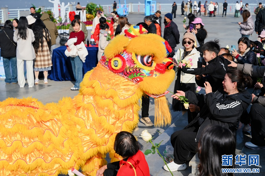 啟動儀式現場氣氛熱烈,民樂演奏、舞獅表演等精彩節目輪番上演,吸引了不少市民、游客駐足欣賞。書法家現場為游客寫對聯,傳遞濃濃的年味和祝福。飛舞盤旋的紅嘴鷗成群結隊,前來觀鷗的市民、游客紛紛與紅嘴鷗互動拍照。