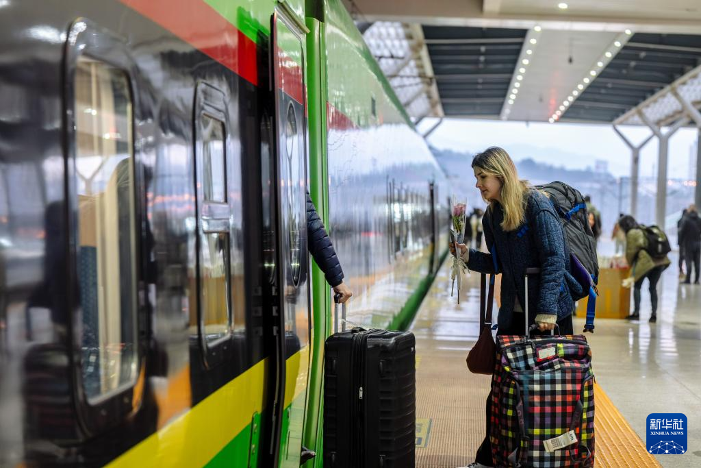 1月14日,一名外國旅客在昆明南站乘坐D87次中老鐵路國際旅客列車。新華社記者 胡超 攝