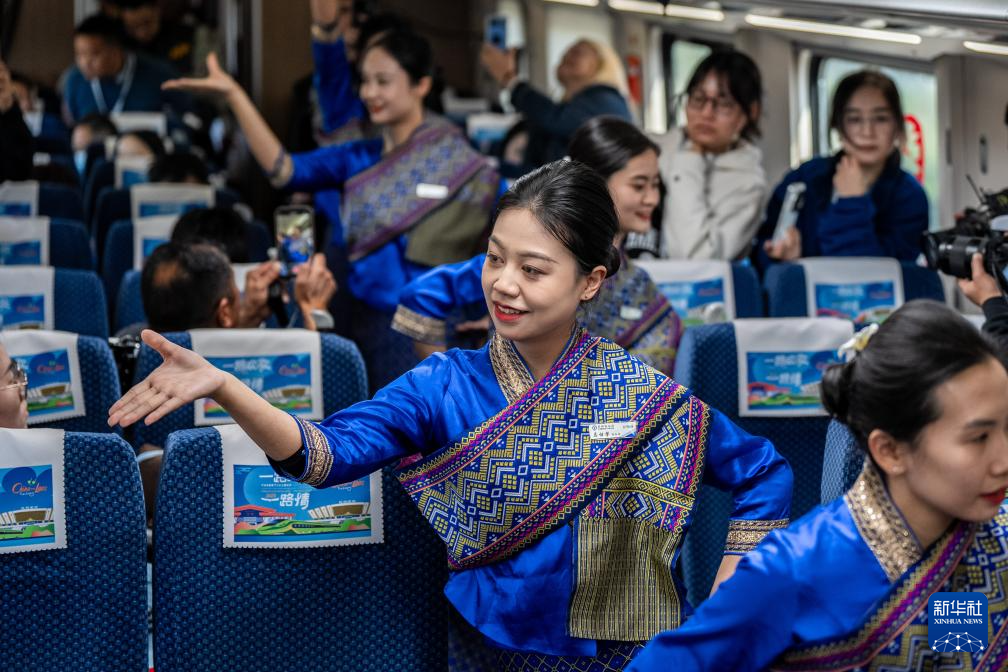 1月14日,中國鐵路昆明局“金花列車員”在D87次中老鐵路國際旅客列車上表演節目。新華社記者 胡超 攝