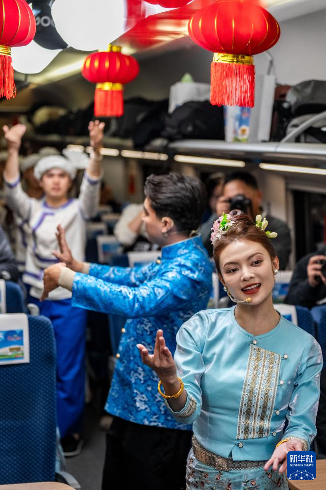 1月14日,西雙版納州民族文化工作團的演員在D87次中老鐵路國際旅客列車上表演歌舞。新華社記者 胡超 攝