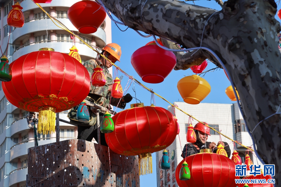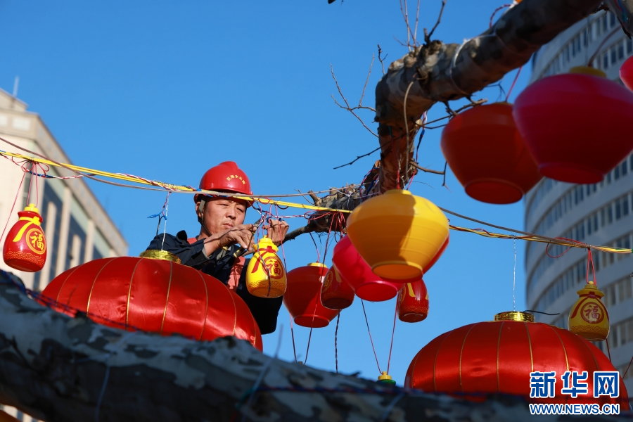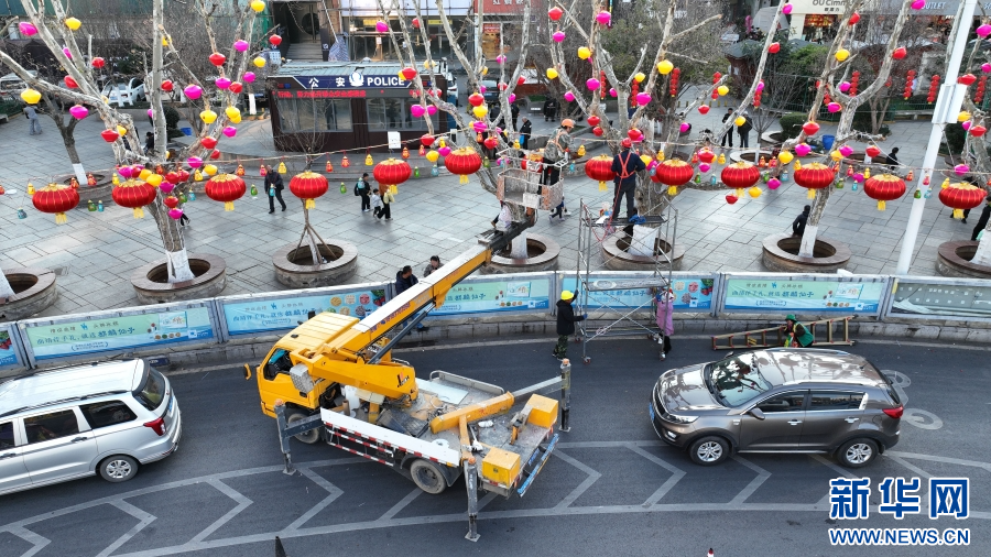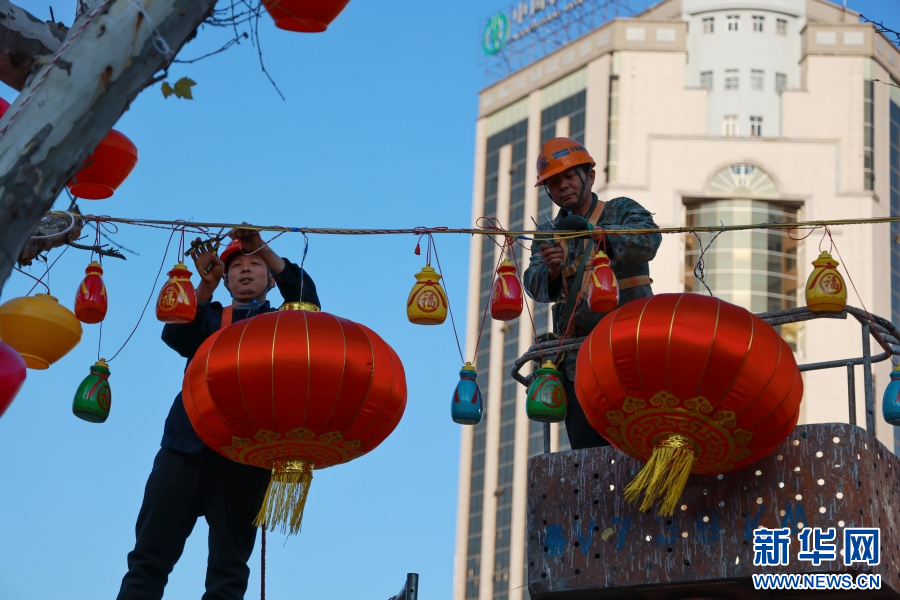 云南曲靖,工作人員在街道上安裝燈飾,喜迎新春(1月13日攝)。新華網發(孫文來 攝)