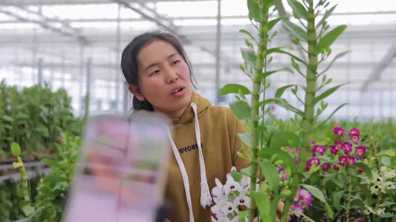 花棚里,網絡主播向觀眾展示自己的花卉,直播帶貨讓消費者們在線上也能選到自己心儀的年宵花。