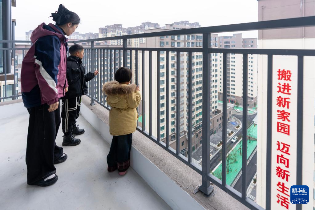1月16日,村民和孩子在新家陽臺上俯看小區。新華社記者 陳欣波 攝
