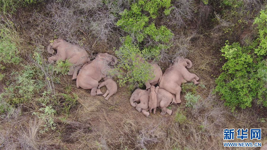 2021年“短鼻家族”在北上南歸途中“抱團”睡覺的經典畫面(資料圖)。新華網發(云南西雙版納國家級自然保護區管護局 供圖)