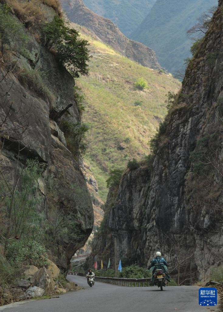 1月13日,桑南才(右)駕駛摩托車穿行在稱桿鄉的山路上送郵件。