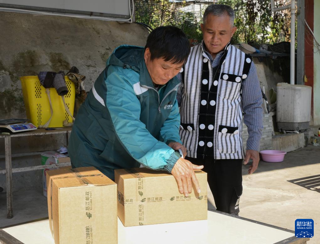 1月12日,桑南才(左)在稱桿鄉雙奎地村幫助村民阿波華郵寄自產的農產品。