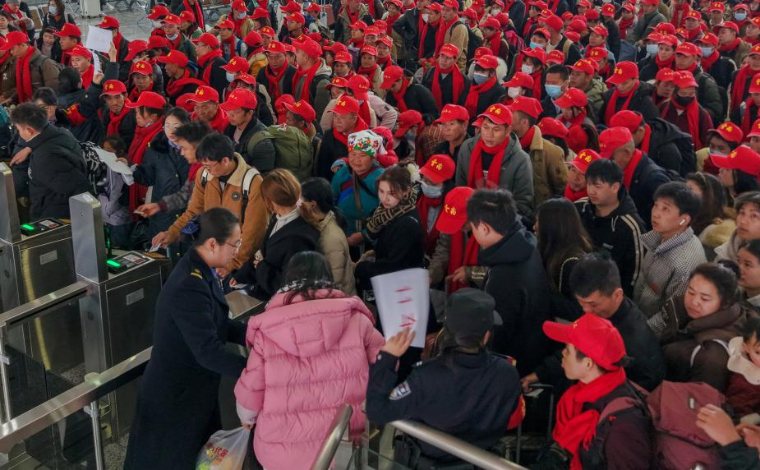 務工人員集中免費乘車返崗就業(2月3日攝)。新華網發(曾三東 攝)