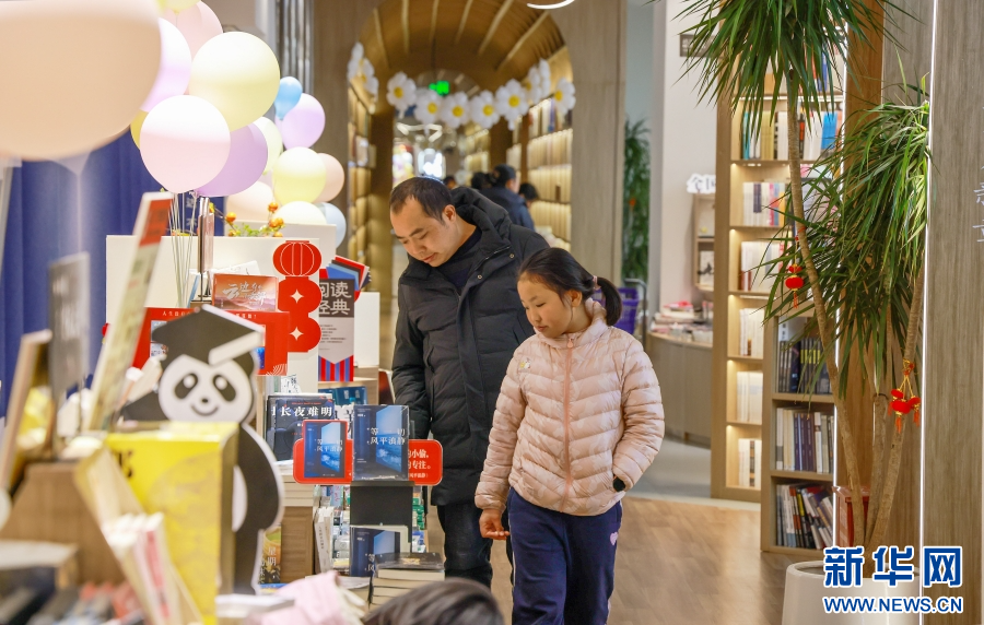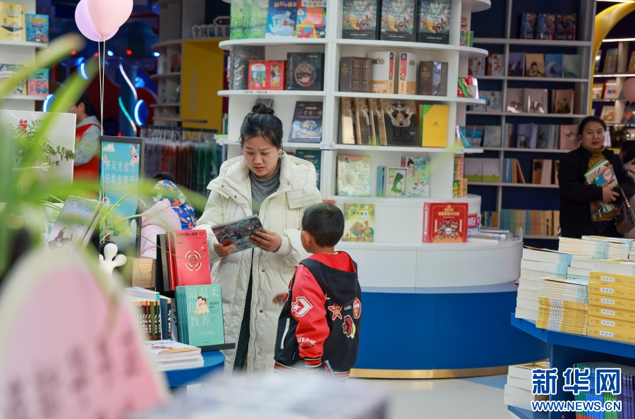 在云南省曲靖市麒麟區新華書店,家長帶著孩子選購書籍(2月5日攝)。新華網發(孫文來 攝)