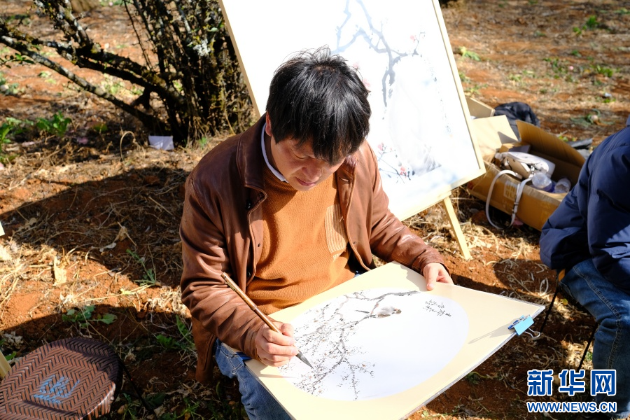 畫梅花(2月7日攝)。新華網發(吳丹 攝)