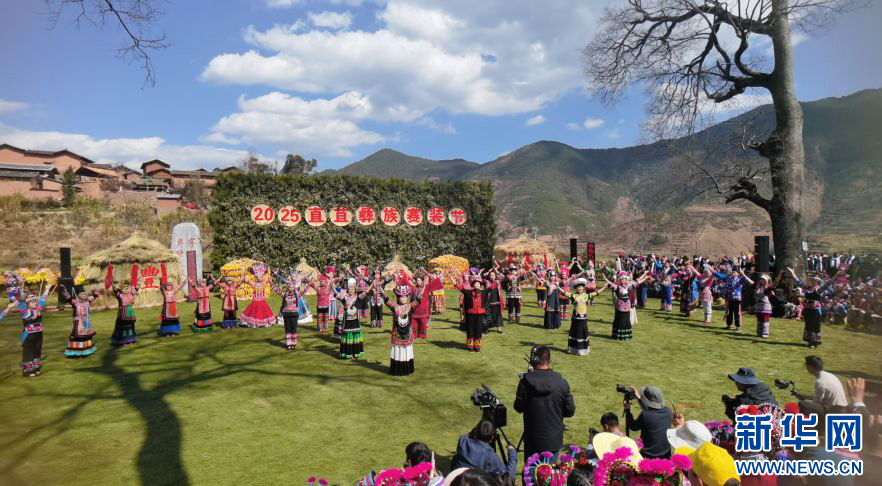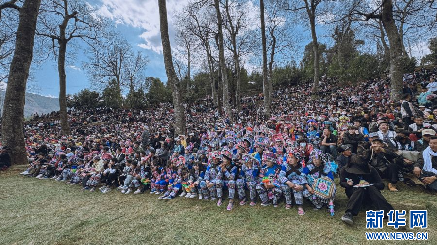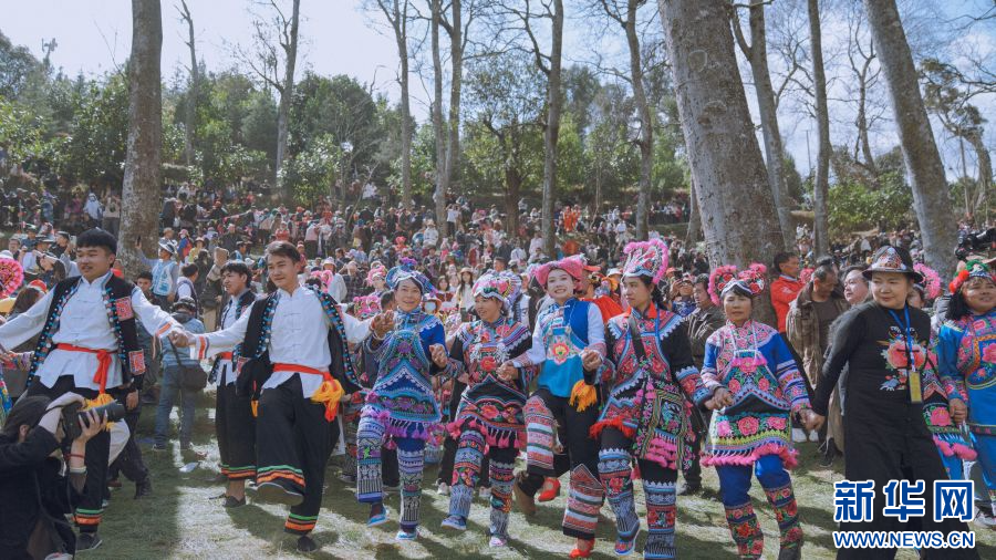 2月12日,在云南省楚雄彝族自治州永仁縣直苴村,來自各村寨的群眾身著傳統節日盛裝匯聚于此,載歌載舞,開啟一年一度的賽裝節。