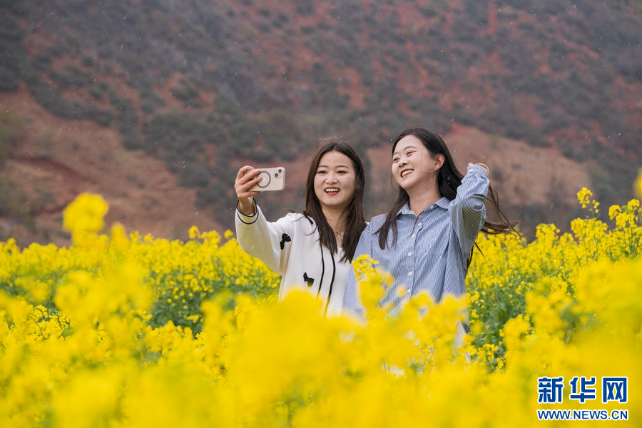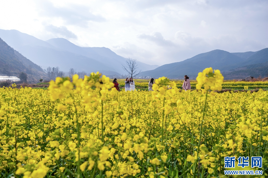 游客在洱源縣鳳羽古鎮的油菜花田里拍照(攝于2月16日)。新華網發(羅新才 攝)