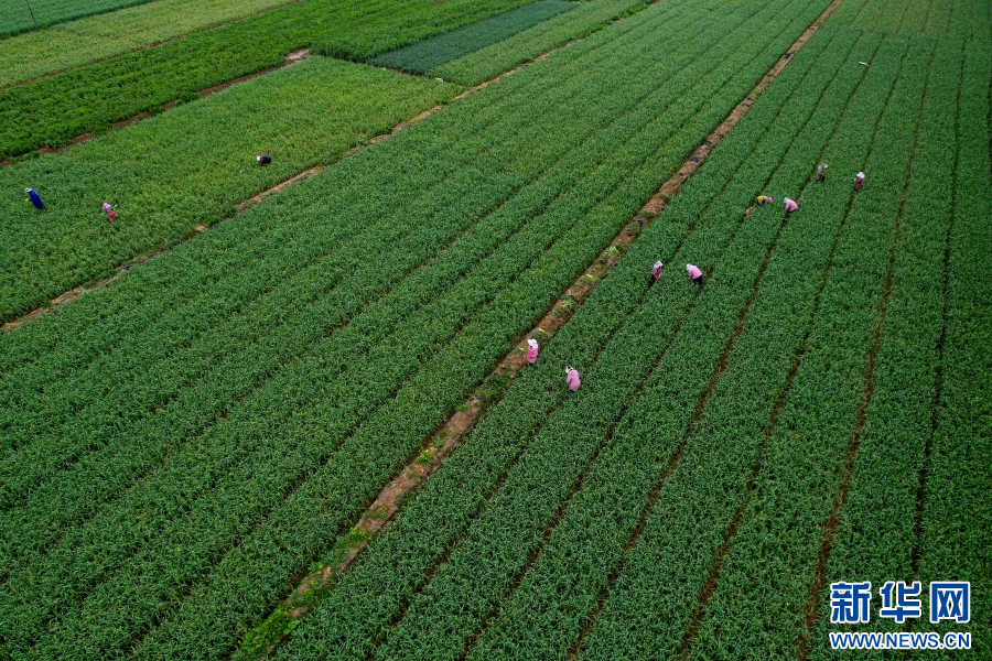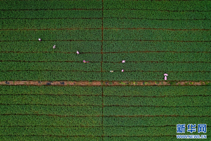航拍越州鎮農民在采收蒜薹(2月16日攝)。新華網發(楊俊鵬 攝)
