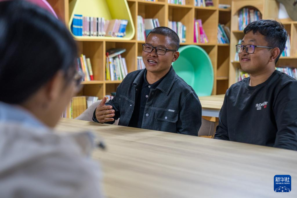 2月27日,青年教師黃光福(中)在休息室與學生聊天。新華社發(彭奕凱攝)