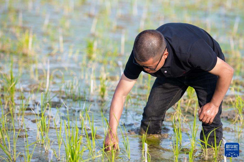 2月27日,青年教師黃光福在試驗田查看多年生稻生長狀況。新華社發(彭奕凱攝)