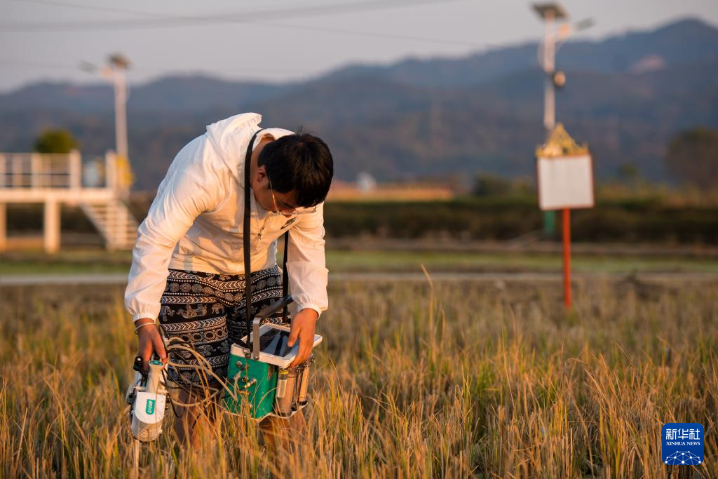 2月27日,多年生稻科技小院的學生在試驗田間檢測植物葉片中的葉綠素含量。新華社發(彭奕凱攝)