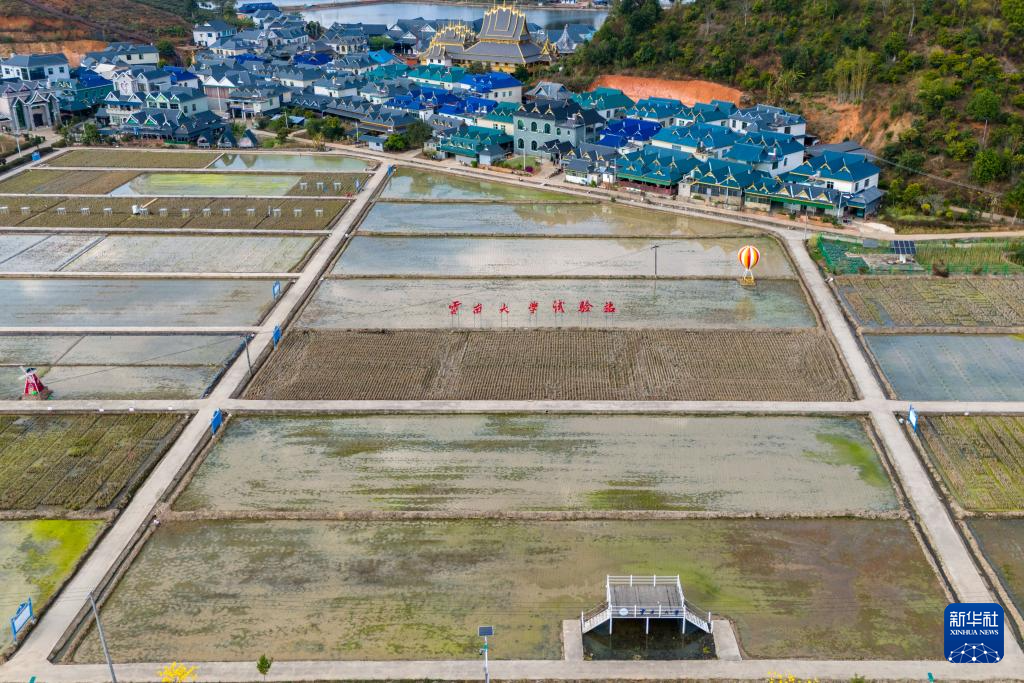 這是2月27日拍攝的云南大學多年生稻科技小院的試驗田(無人機照片)。新華社發(彭奕凱攝)