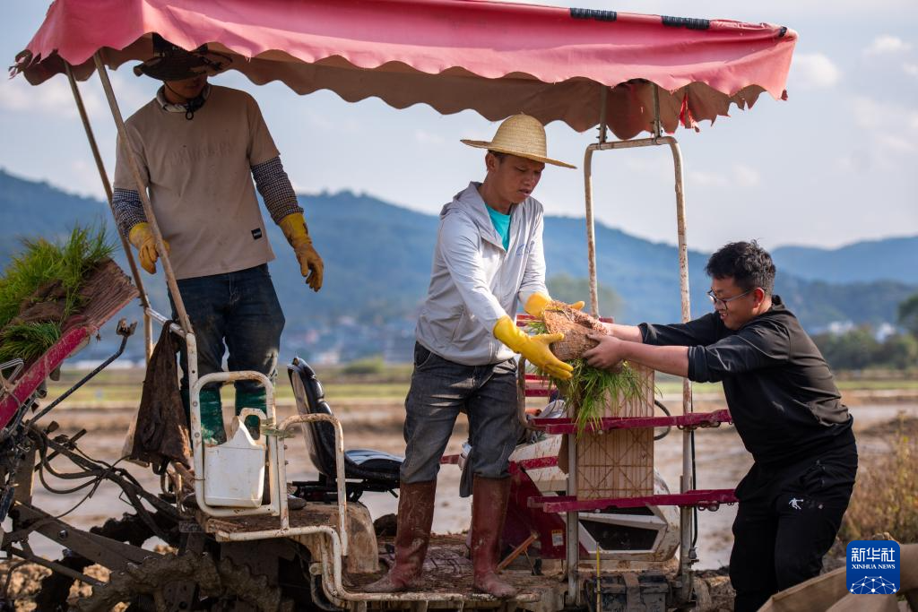 2月27日,多年生稻科技小院的學生(右一)幫助當地農民一起插秧。新華社發(彭奕凱攝)