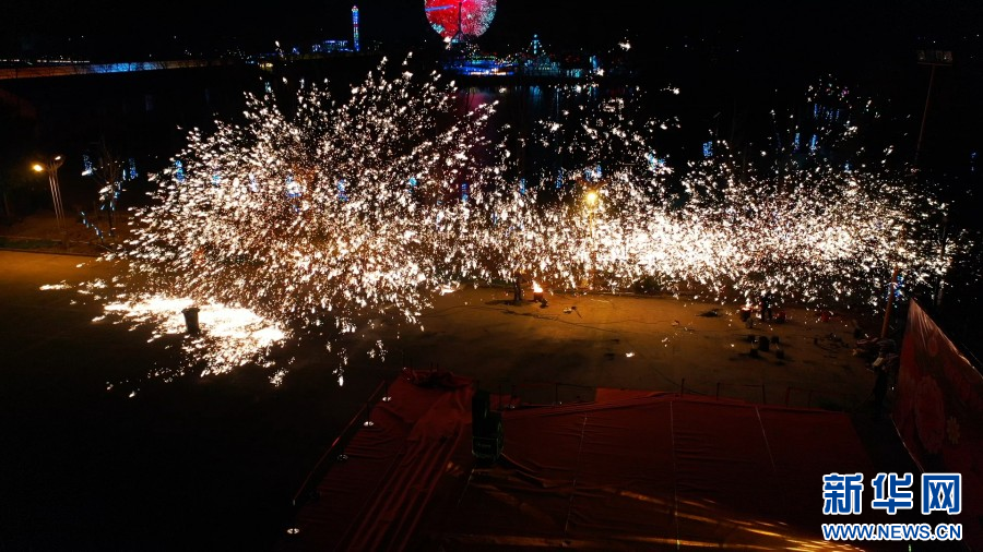 近日,在云南省昭通市魯甸縣,匠人們奮力將燒得滾燙的鐵水打向空中,展示“打鐵花”民俗。鐵花飛濺,為在場的群眾獻上一場極致的視覺盛宴。(陳科邦 楊舒凡)