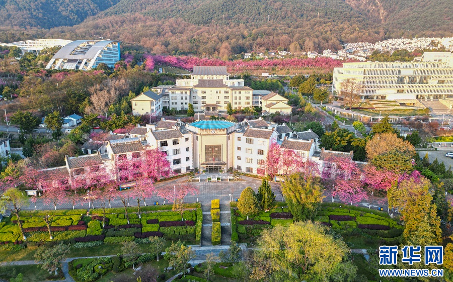 航拍大理大學櫻花盛放(3月11日攝)。新華網發(郭康 攝)
