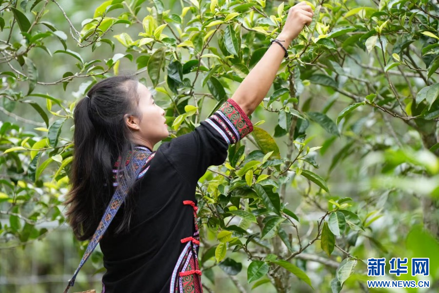 茶農李如萍正在采茶(3月17日攝)。新華網發 (景谷縣融媒體中心供圖)
