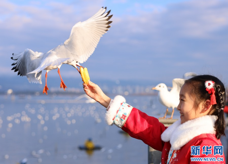 游客在滇池邊喂紅嘴鷗(資料圖)。新華網發(劉元嵩 攝)