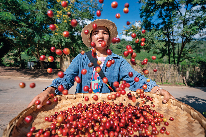 在云南省普洱市孟連傣族拉祜族佤族自治縣橋安咖啡莊園,一名咖農在翻曬咖啡鮮果(2024年10月30日攝)   陳欣波攝 / 本刊