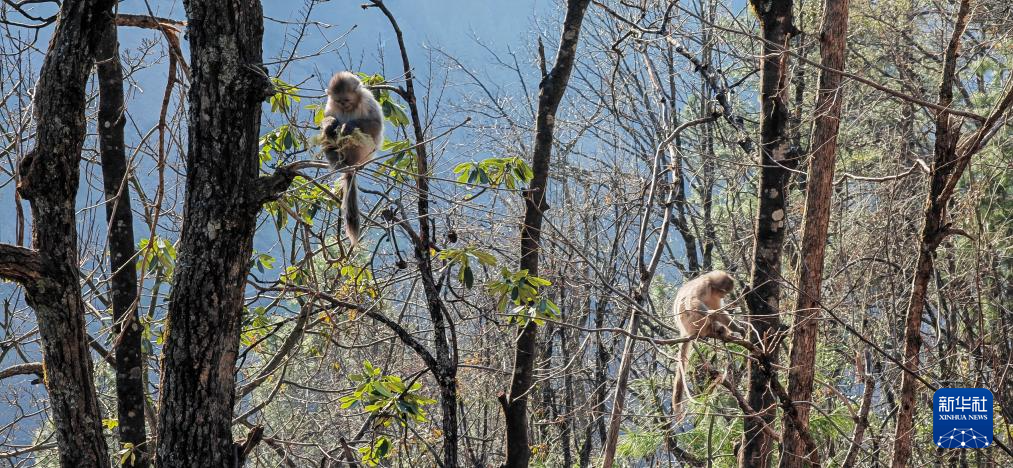 2025年3月10日,在白馬雪山國家級自然保護區響古箐片區,兩只滇金絲猴正在樹上玩耍。新華社記者 浦超 攝