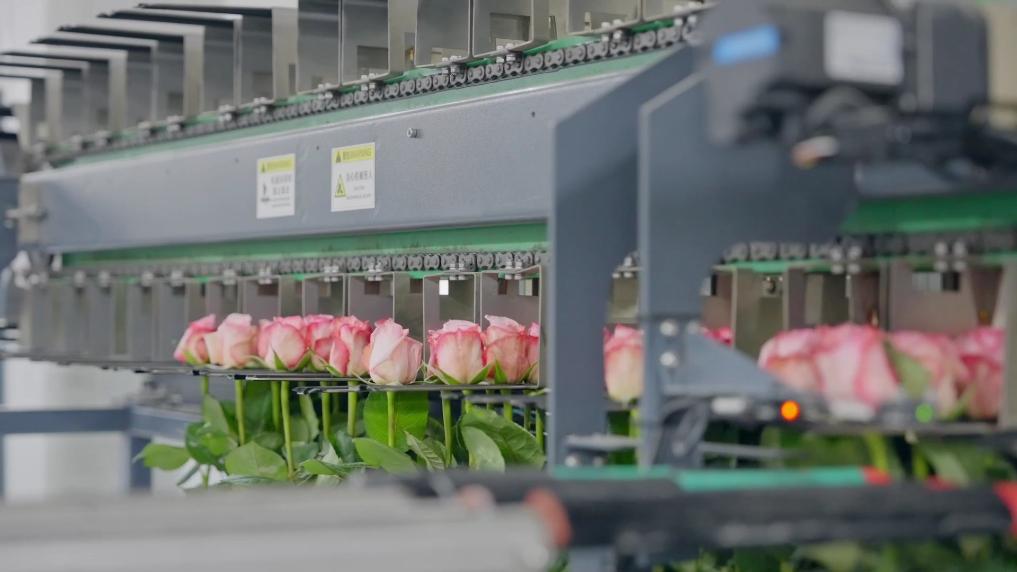 在園區采后處理中心,鮮切花玫瑰采摘后迅速預冷保鮮,打刺去葉后,紅外成像識別系統檢測花朵開放度、枝干長度和粗細,并按等級分類。隨后,自動化設備完成捆扎與包裝。