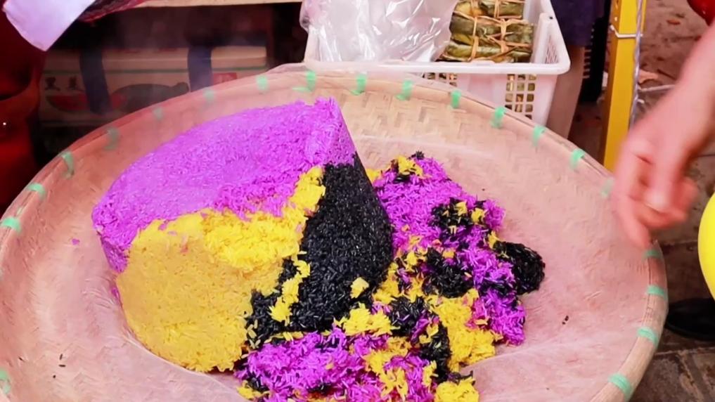 在師宗縣,游客還可以親身體驗花米飯制作?;罪埵菐熥诳h當地用來歡慶節日的美食,以糯米為原料,從不同的可食用天然植物中提取汁液作為染料。
