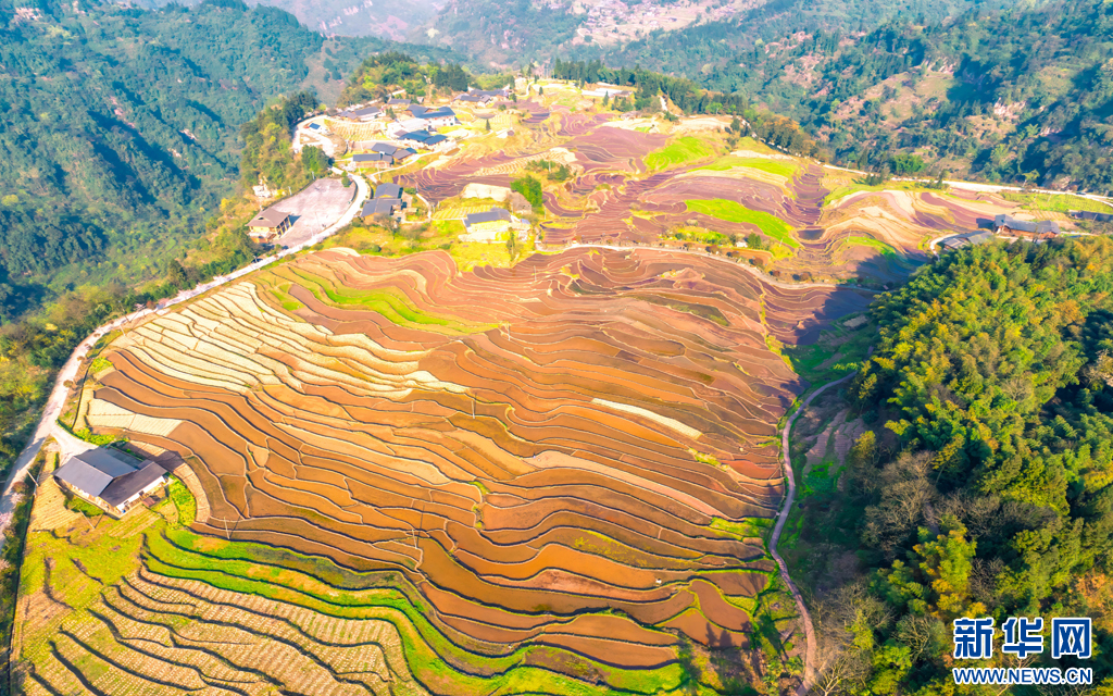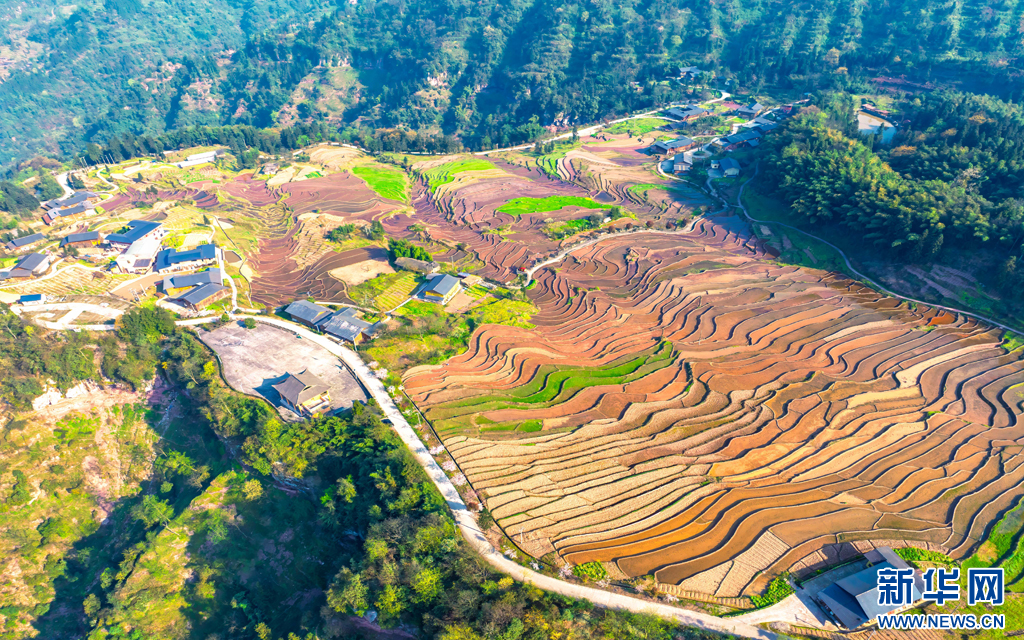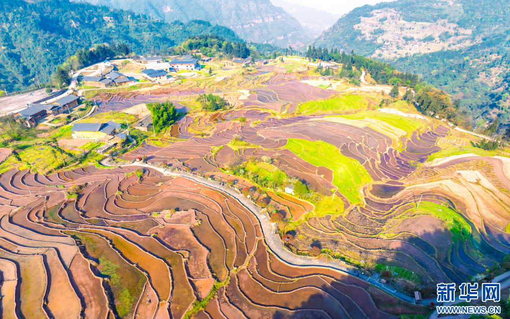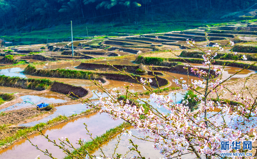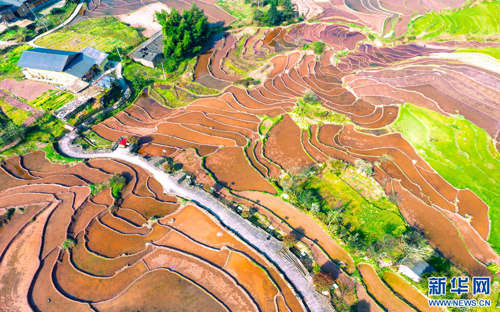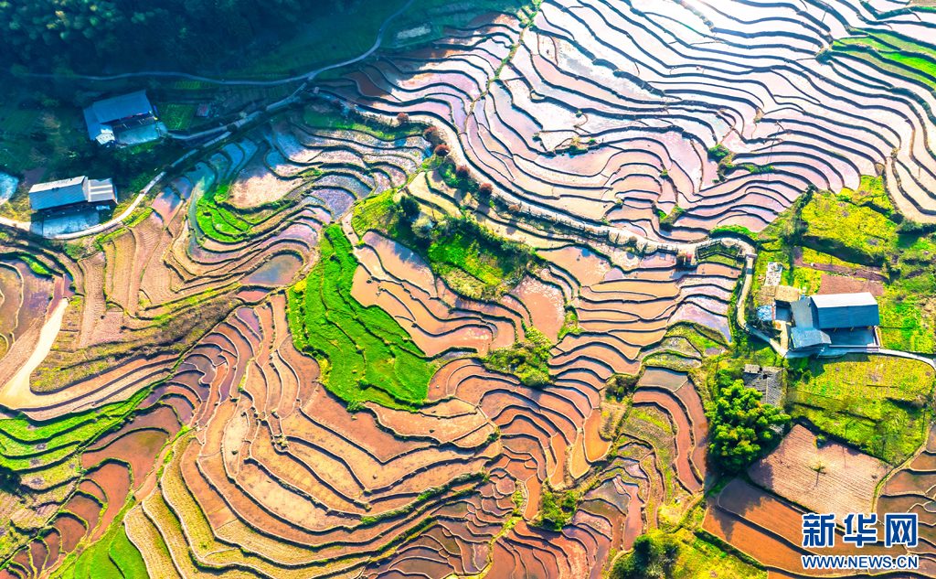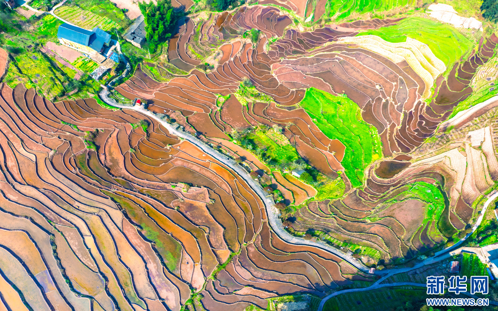 層層疊疊的梯田構成一幅春日和美鄉村田園畫卷(3月27日攝)。新華網發(曾三東 攝)
