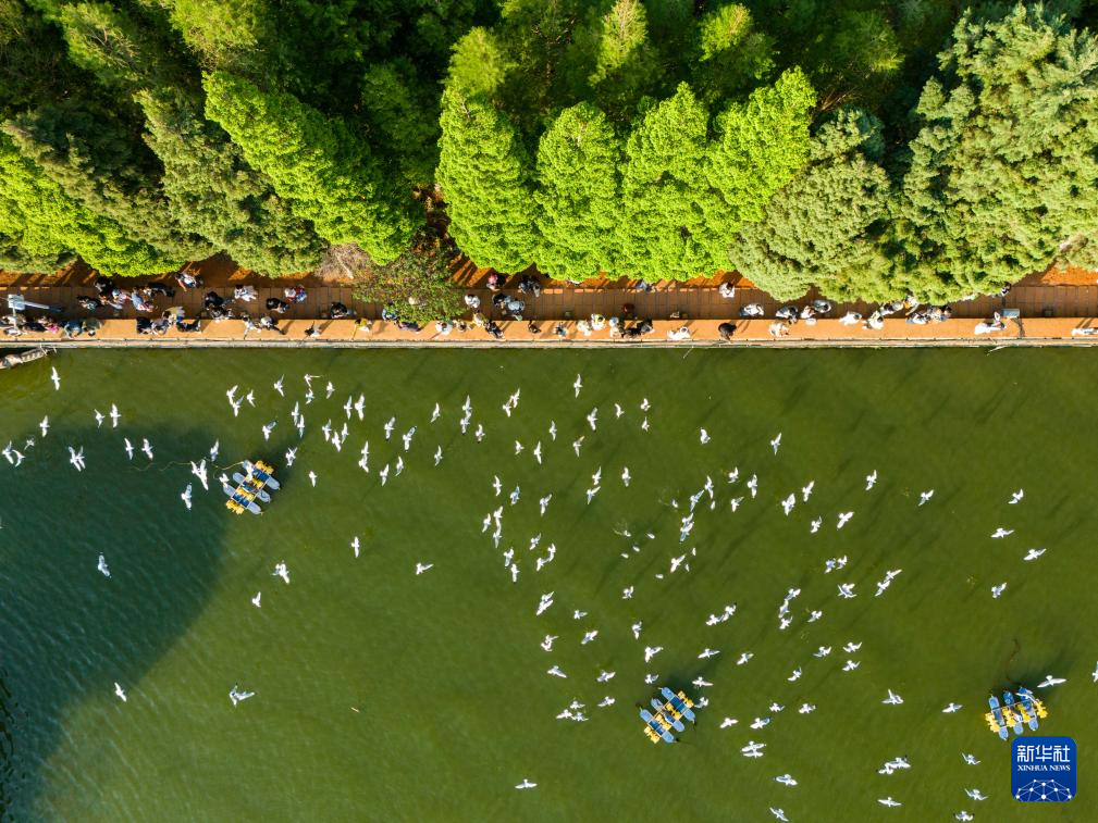 4月13日,市民游客在昆明海洪濕地公園觀鷗喂鷗(無人機照片)。