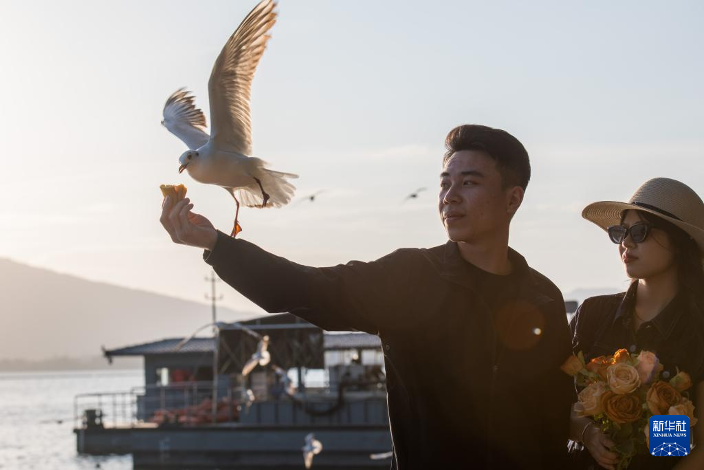 4月13日,游客在昆明海洪濕地公園喂紅嘴鷗。