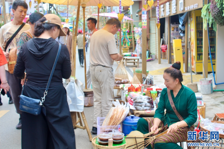 在景洪市嘎灑街道曼占宰社區曼景保居民小組,“去傣族老庚家過傣歷新年節”活動熱鬧開場。香甜軟糯的“毫糯索”、鮮甜多汁的熱帶水果、香氣四溢的傣味燒烤擺滿長街宴,游客們一邊品嘗特色美食,一邊欣賞民族歌舞表演?;顒蝇F場還設置了傣族織錦技藝、傣族慢輪制陶技藝等非遺體驗區,讓游客親手感受傳統手工藝的精妙。
