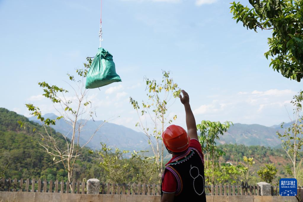 4月14日,昔歸村茶農準備取下無人機運回的茶葉鮮葉。新華社發(金維娜 攝)