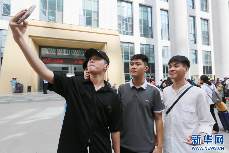 越南游客在中國河口公路口岸南溪河聯檢大樓前合影留念(5月2日攝)。新華網發(薛瑩瑩 攝)