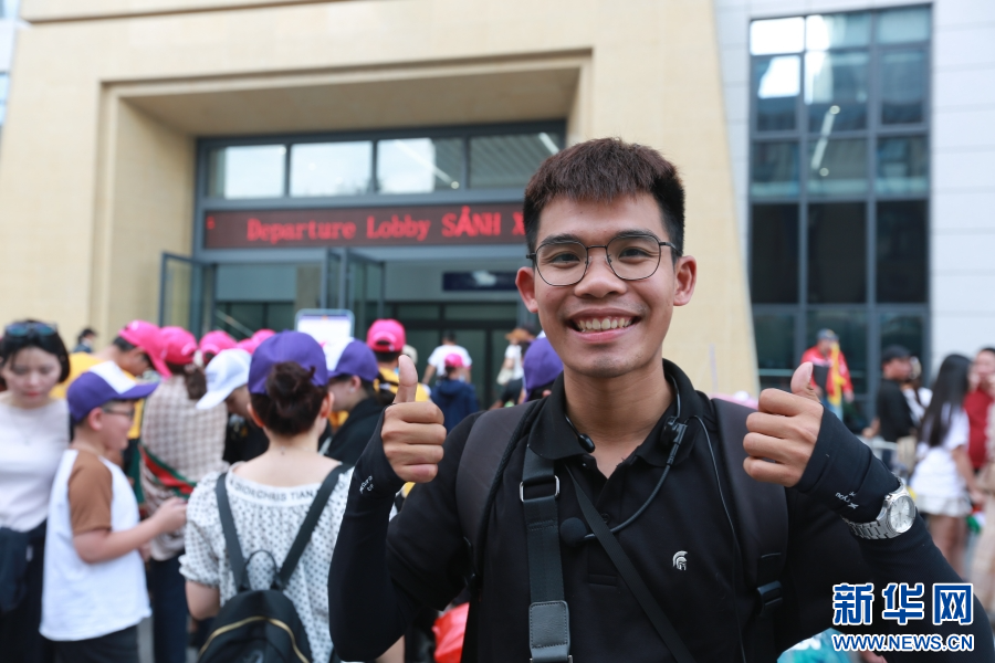 在中國河口公路口岸南溪河聯檢大樓前,一名越南游客對著鏡頭點贊(5月2日攝)。新華網發(薛瑩瑩 攝)