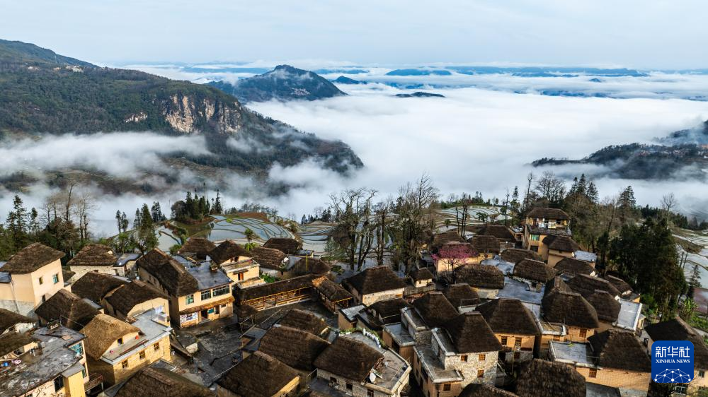 這是2月26日拍攝的云南省元陽縣阿者科村的“蘑菇房”與云海、梯田(無人機照片)。新華社記者 胡超 攝