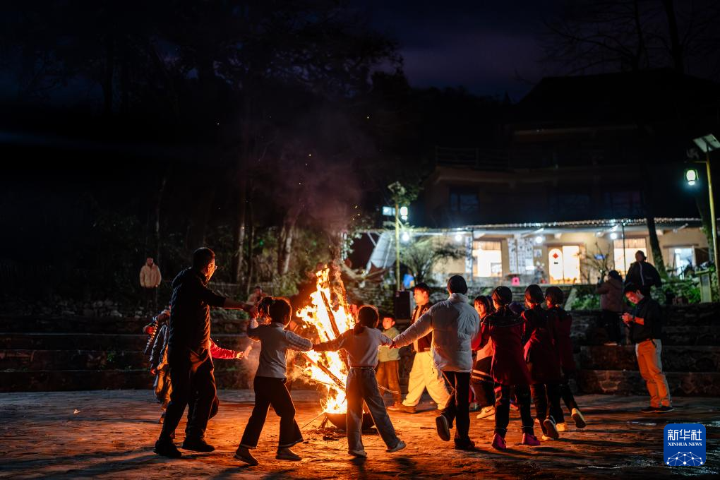 2月26日,在云南省元陽縣多依樹村,哈尼族群眾和游客圍著篝火跳樂作舞。新華社記者 胡超 攝